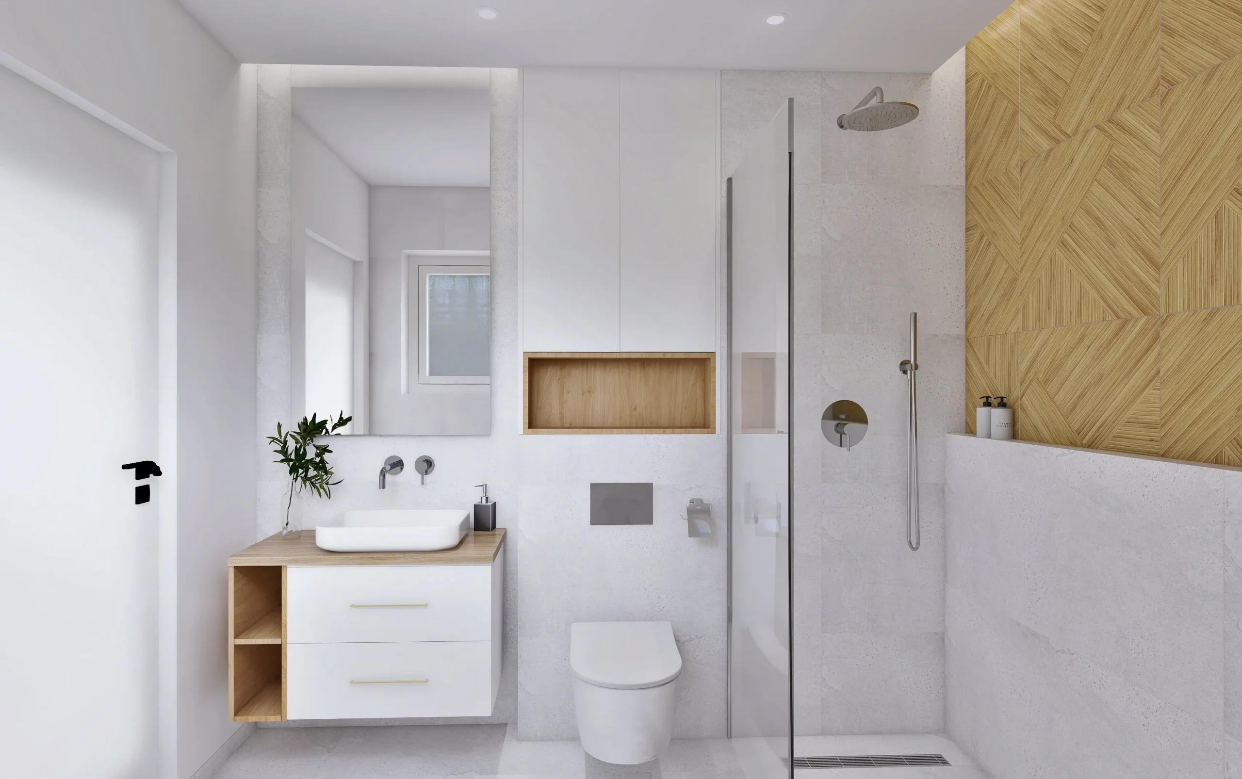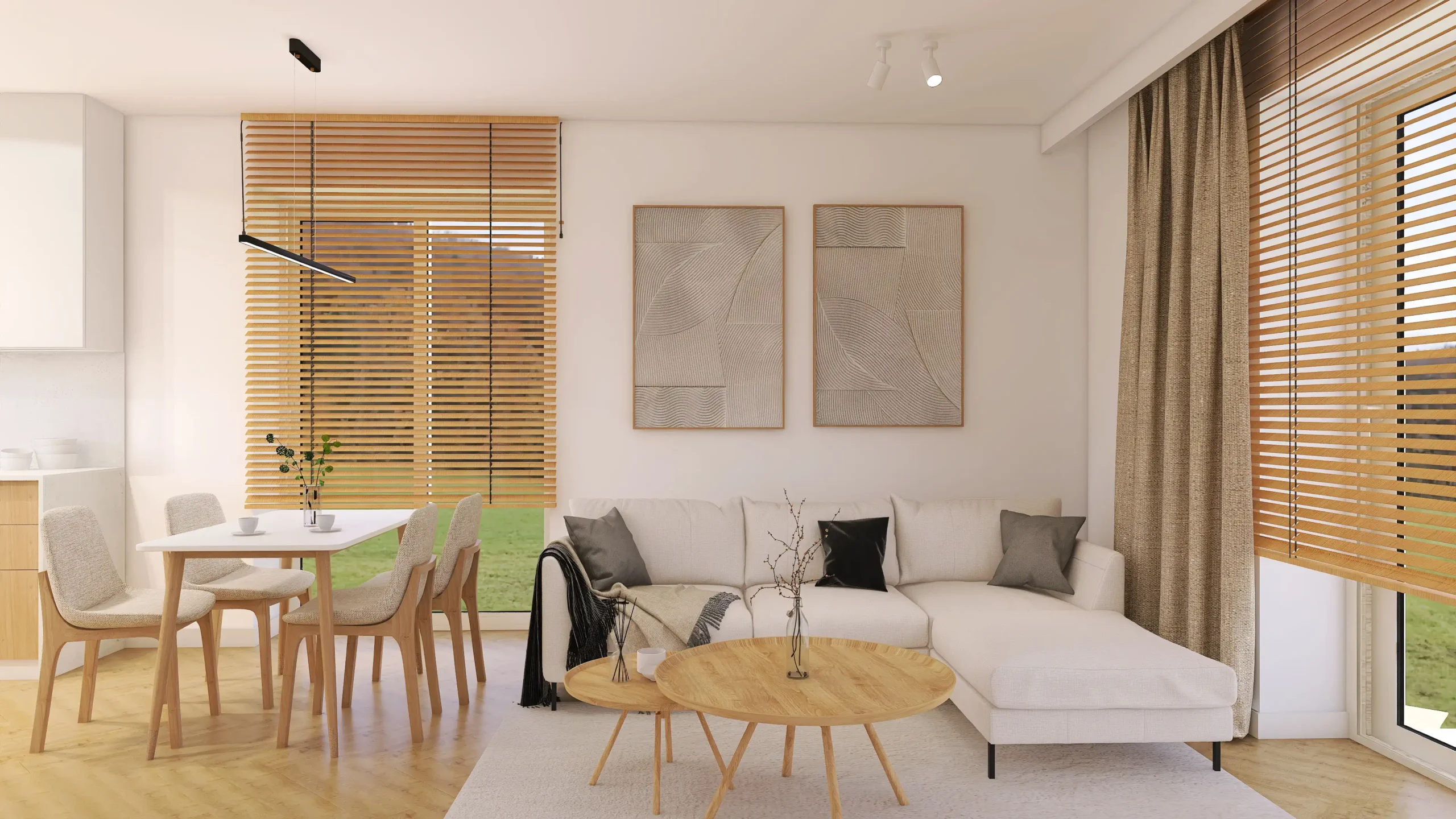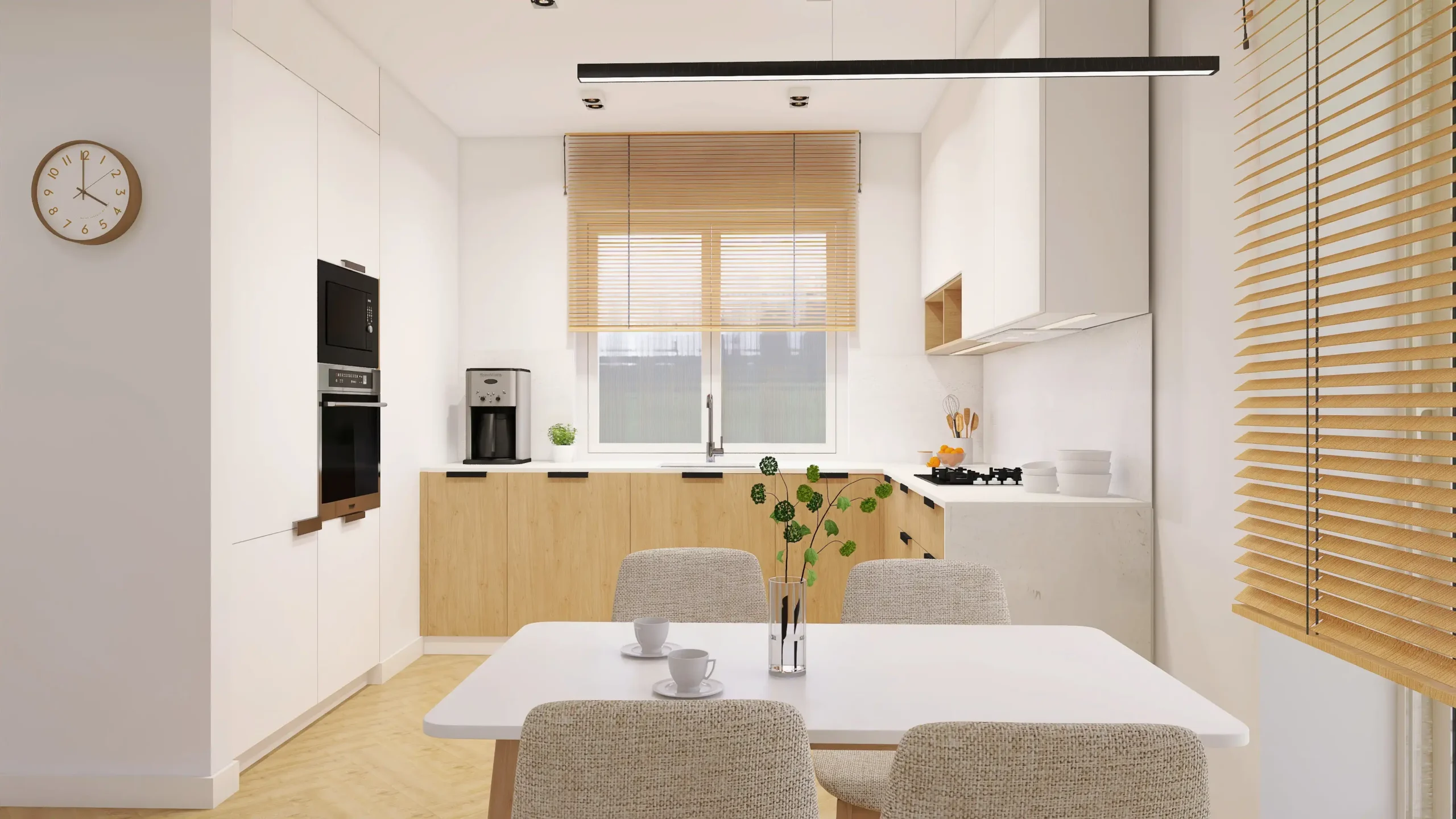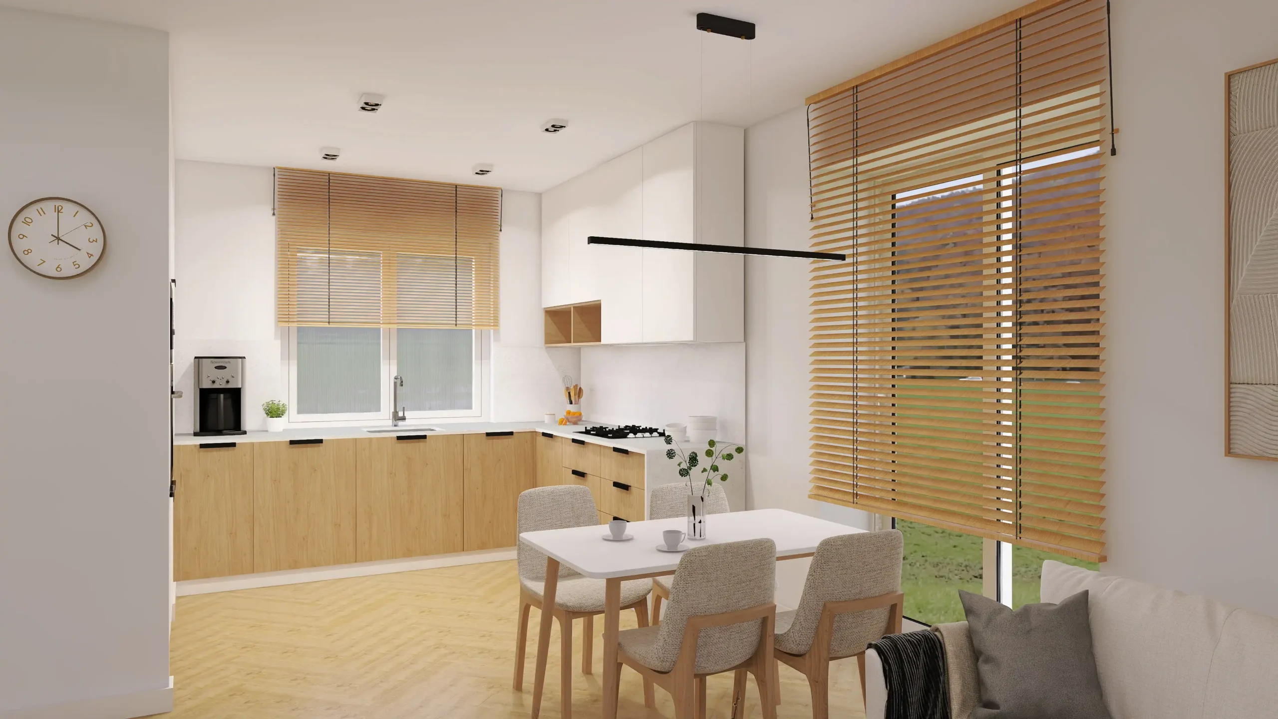 Całość wnętrza utrzymana jest w naturalnej palecie barw, gdzie dominuje ciepło drewna i świeżość bieli. Minimalistyczny styl podkreślają starannie dobrane detale oraz naturalne materiały, które nadają przestrzeni harmonijny i spokojny charakter. Projekt odzwierciedla dążenie do prostoty, jednocześnie zapewniając pełen komfort codziennego użytkowania.