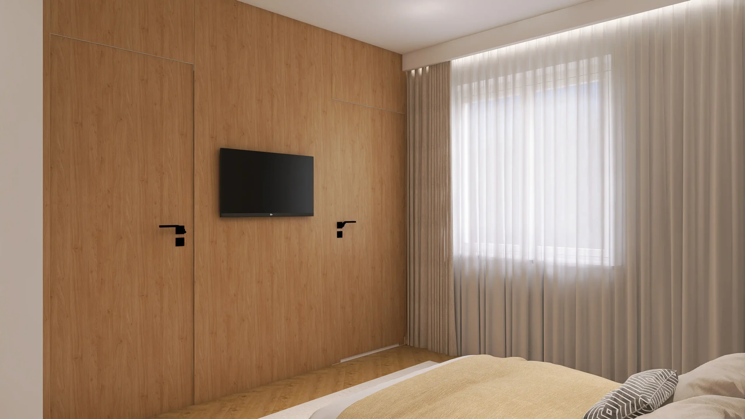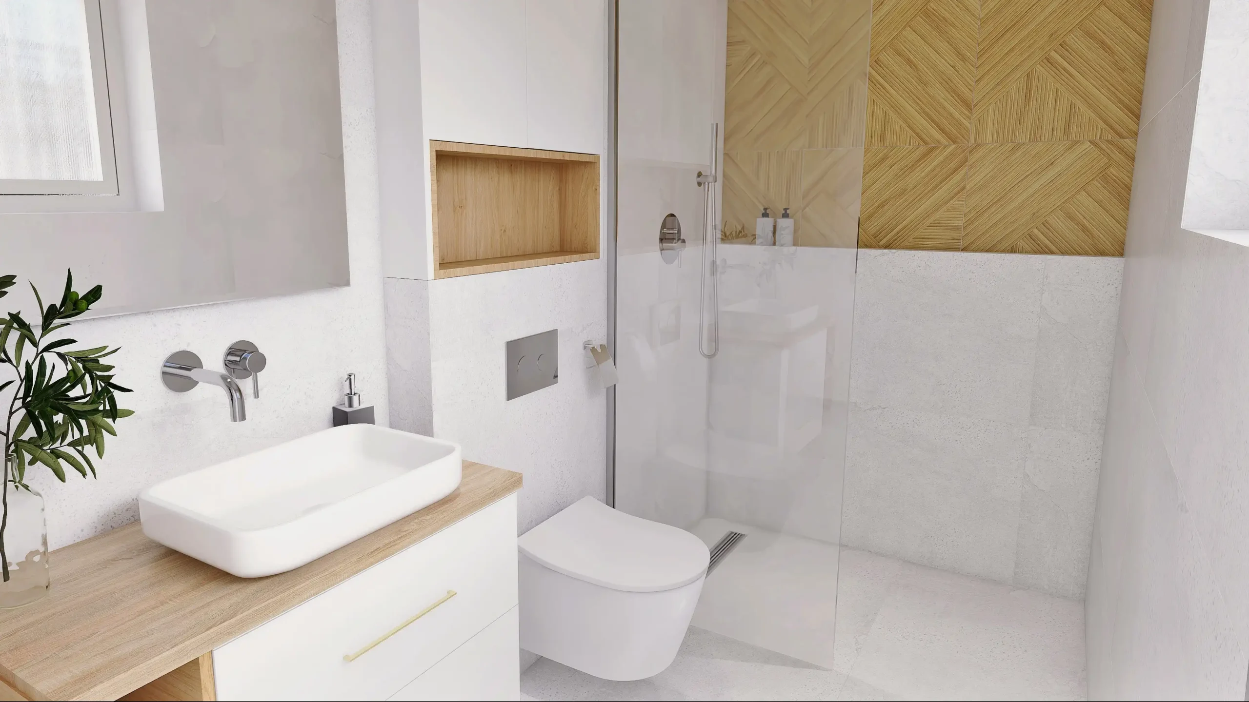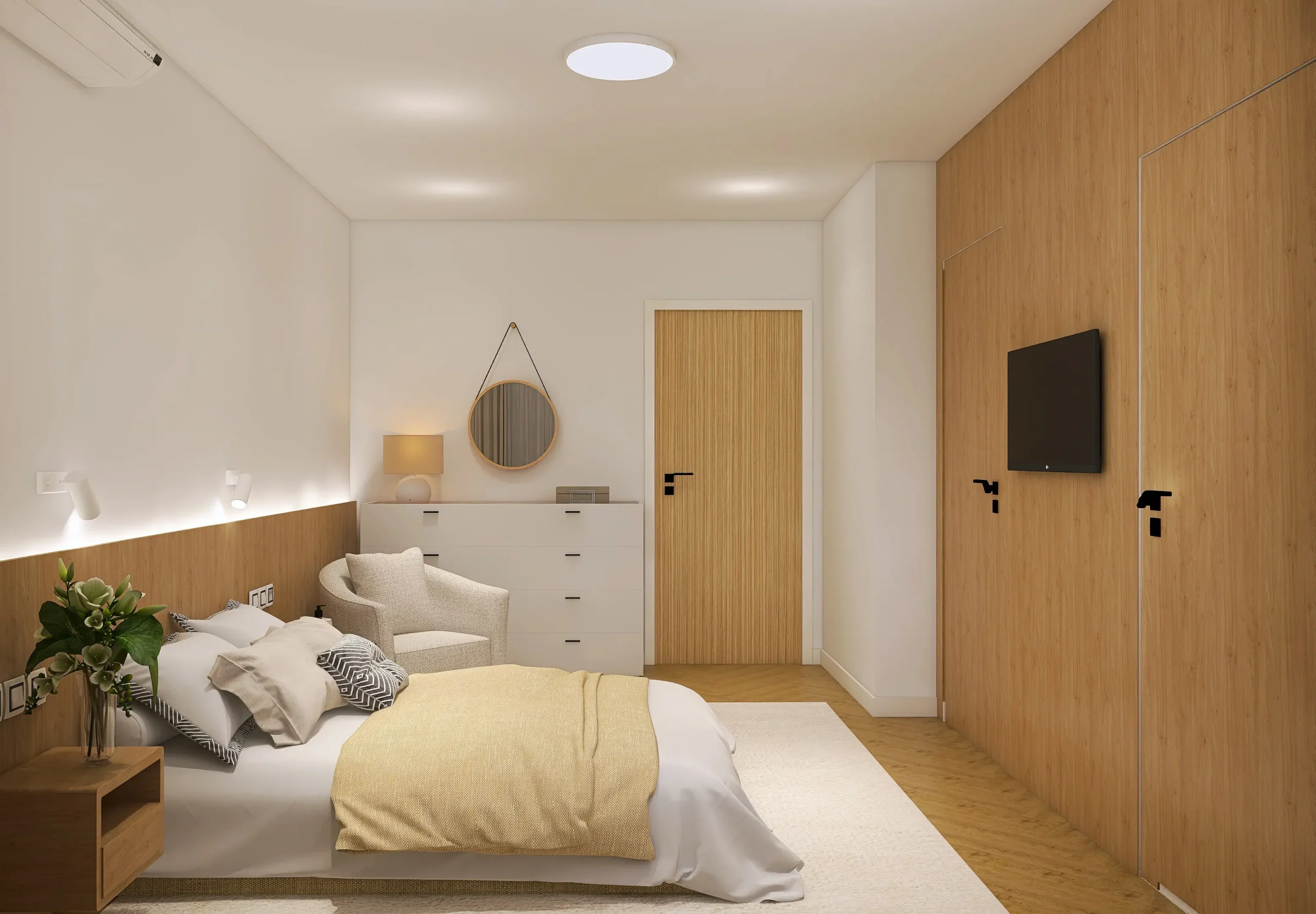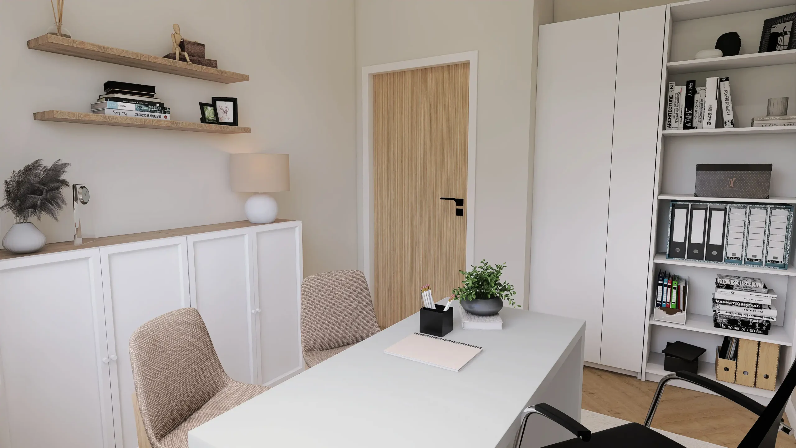 Całość wnętrza utrzymana jest w naturalnej palecie barw, gdzie dominuje ciepło drewna i świeżość bieli. Minimalistyczny styl podkreślają starannie dobrane detale oraz naturalne materiały, które nadają przestrzeni harmonijny i spokojny charakter. Projekt odzwierciedla dążenie do prostoty, jednocześnie zapewniając pełen komfort codziennego użytkowania.