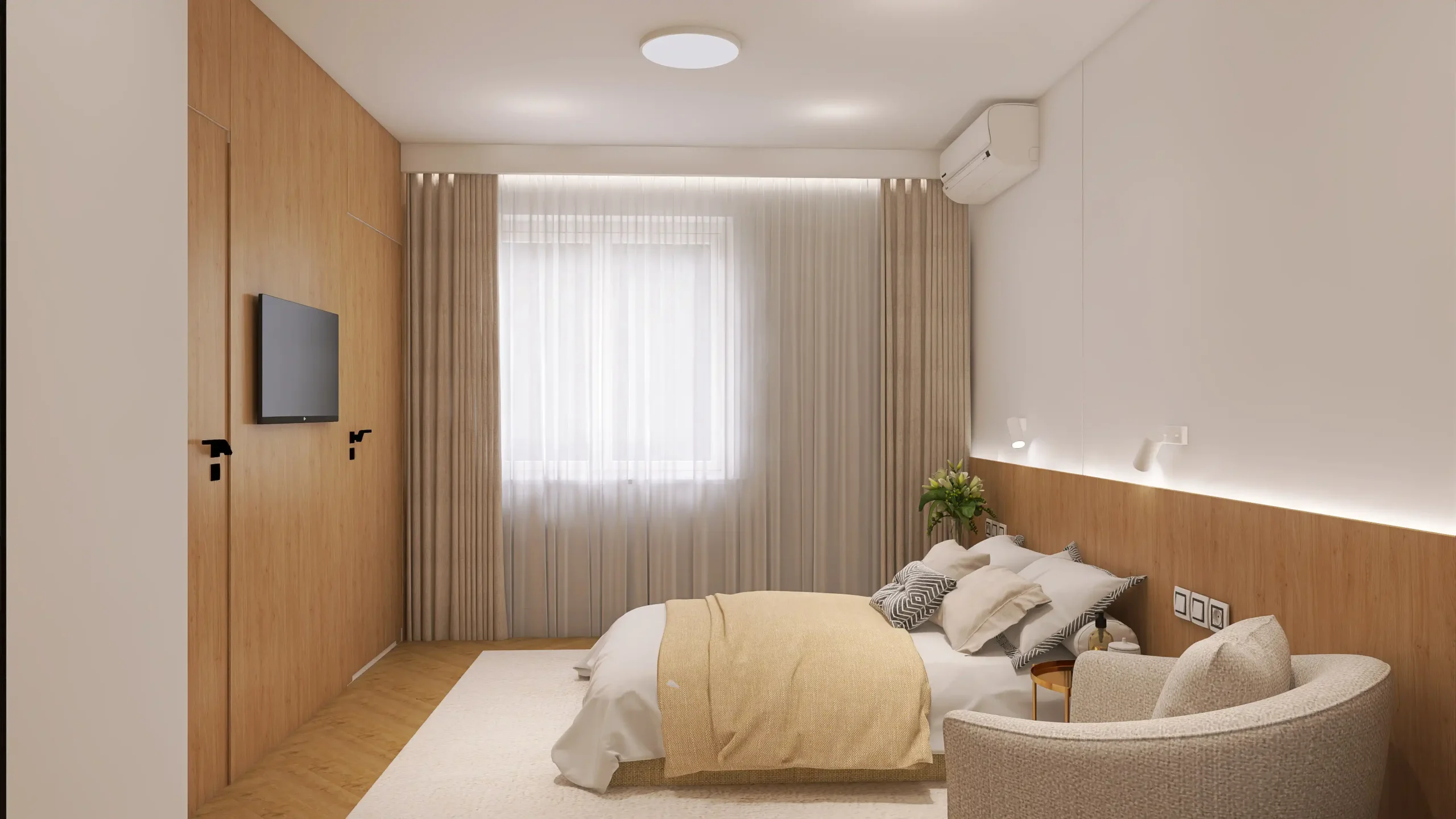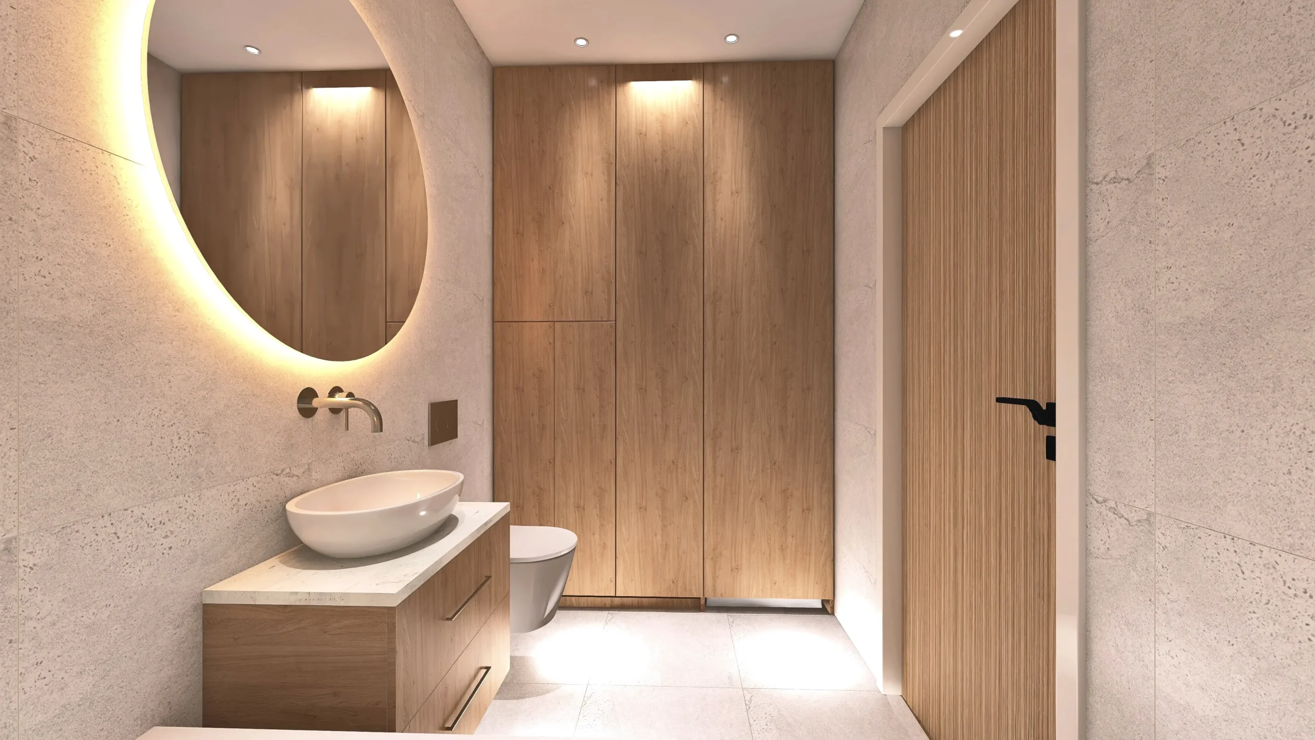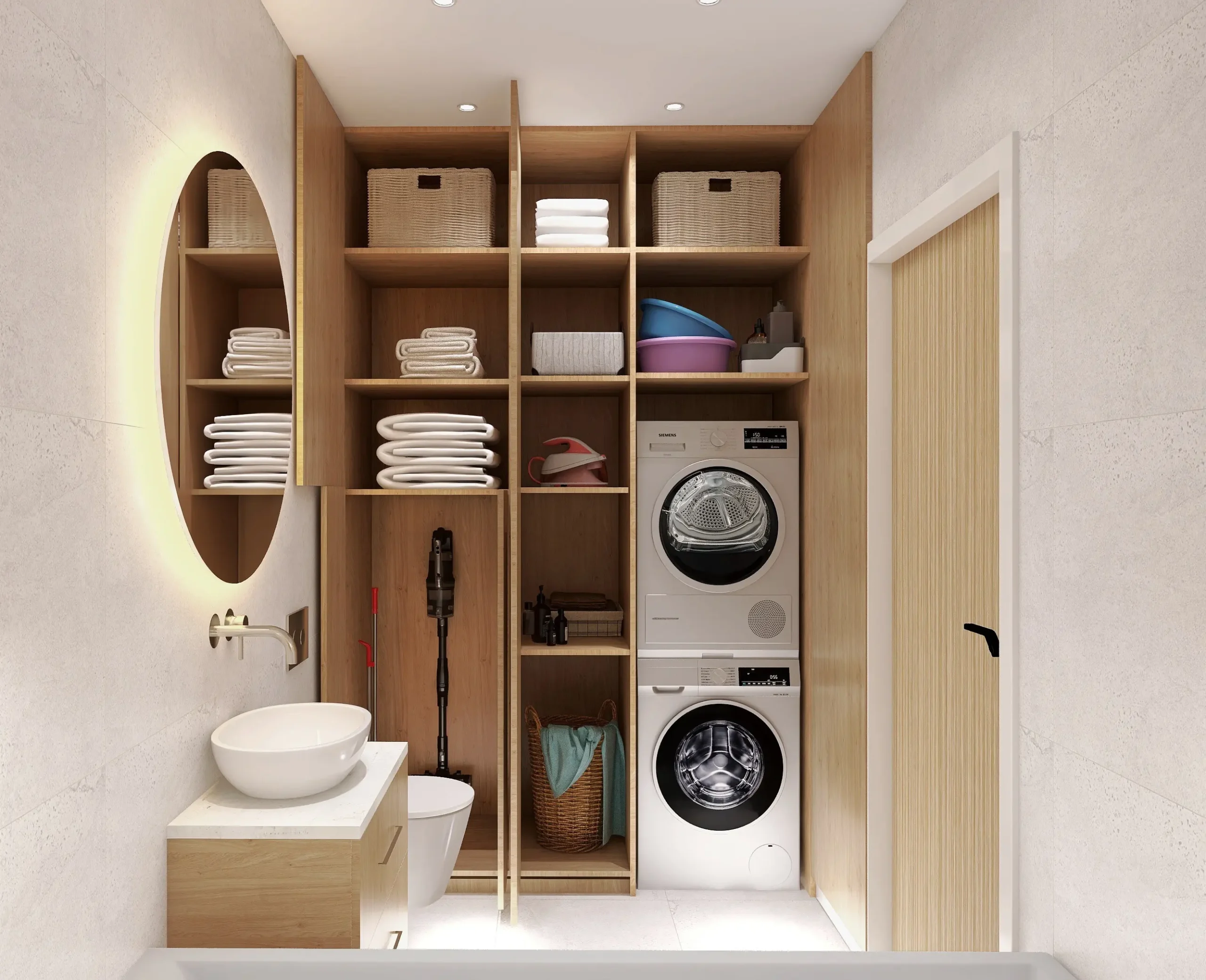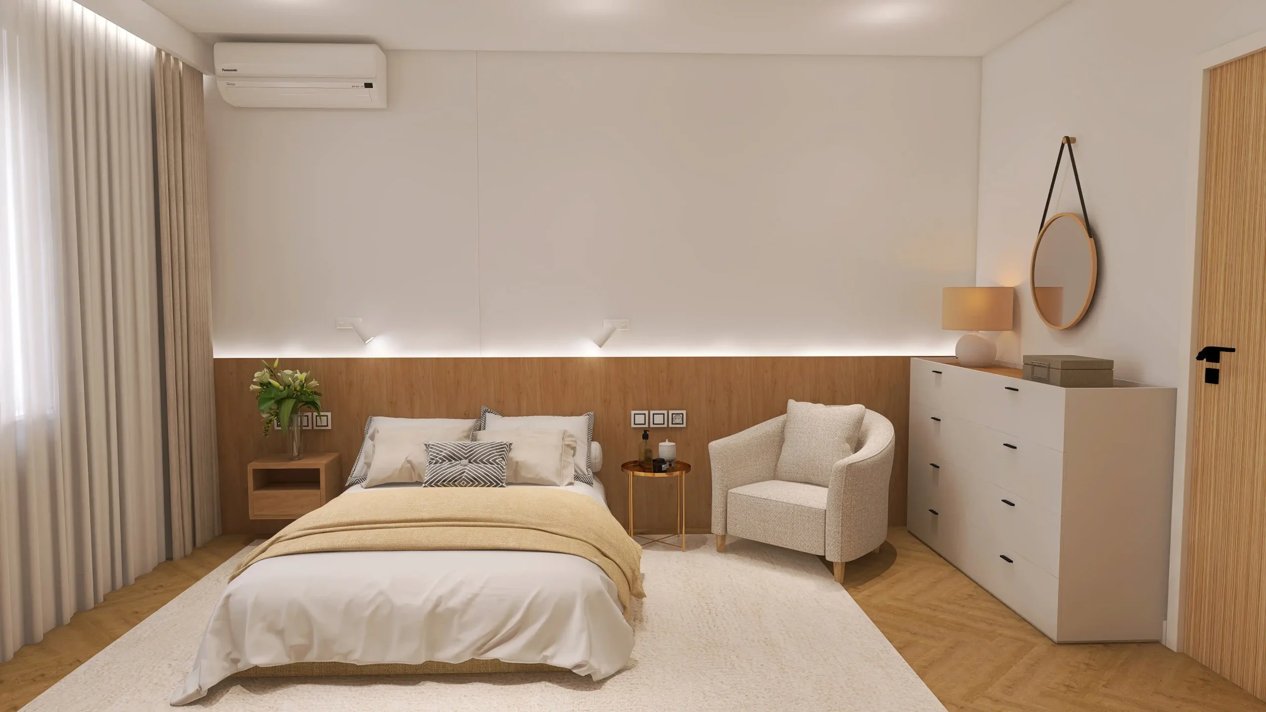 Całość wnętrza utrzymana jest w naturalnej palecie barw, gdzie dominuje ciepło drewna i świeżość bieli. Minimalistyczny styl podkreślają starannie dobrane detale oraz naturalne materiały, które nadają przestrzeni harmonijny i spokojny charakter. Projekt odzwierciedla dążenie do prostoty, jednocześnie zapewniając pełen komfort codziennego użytkowania.
