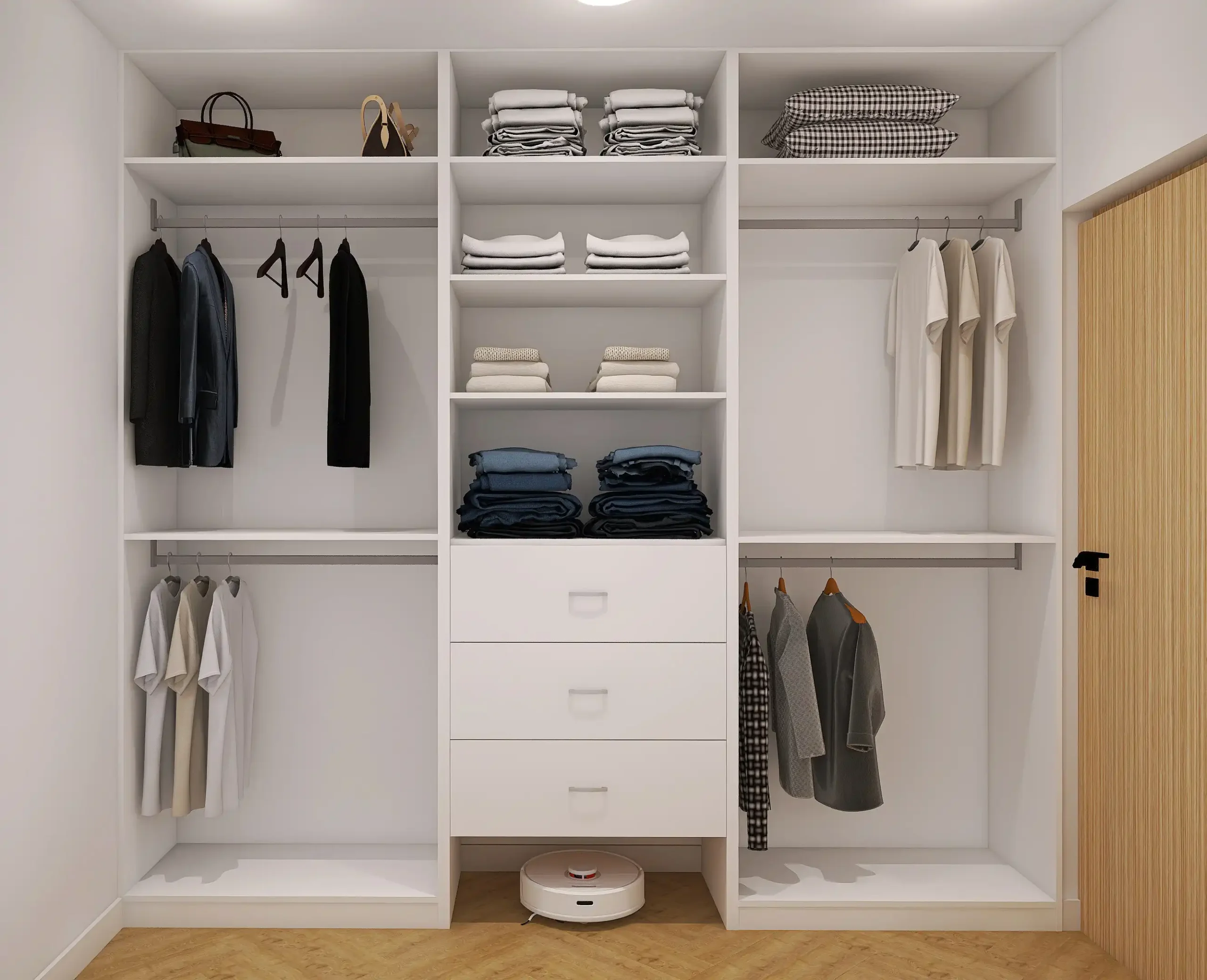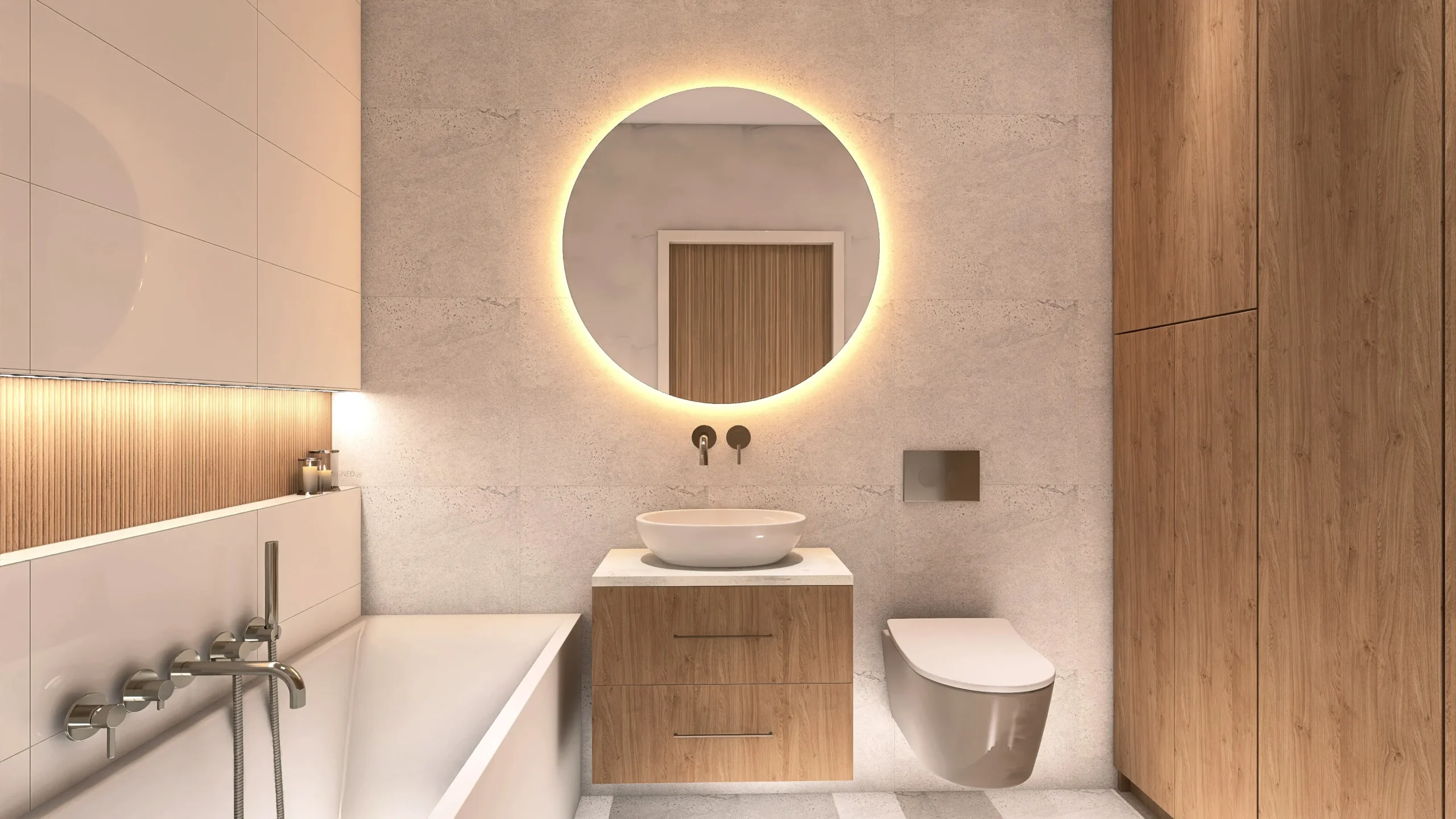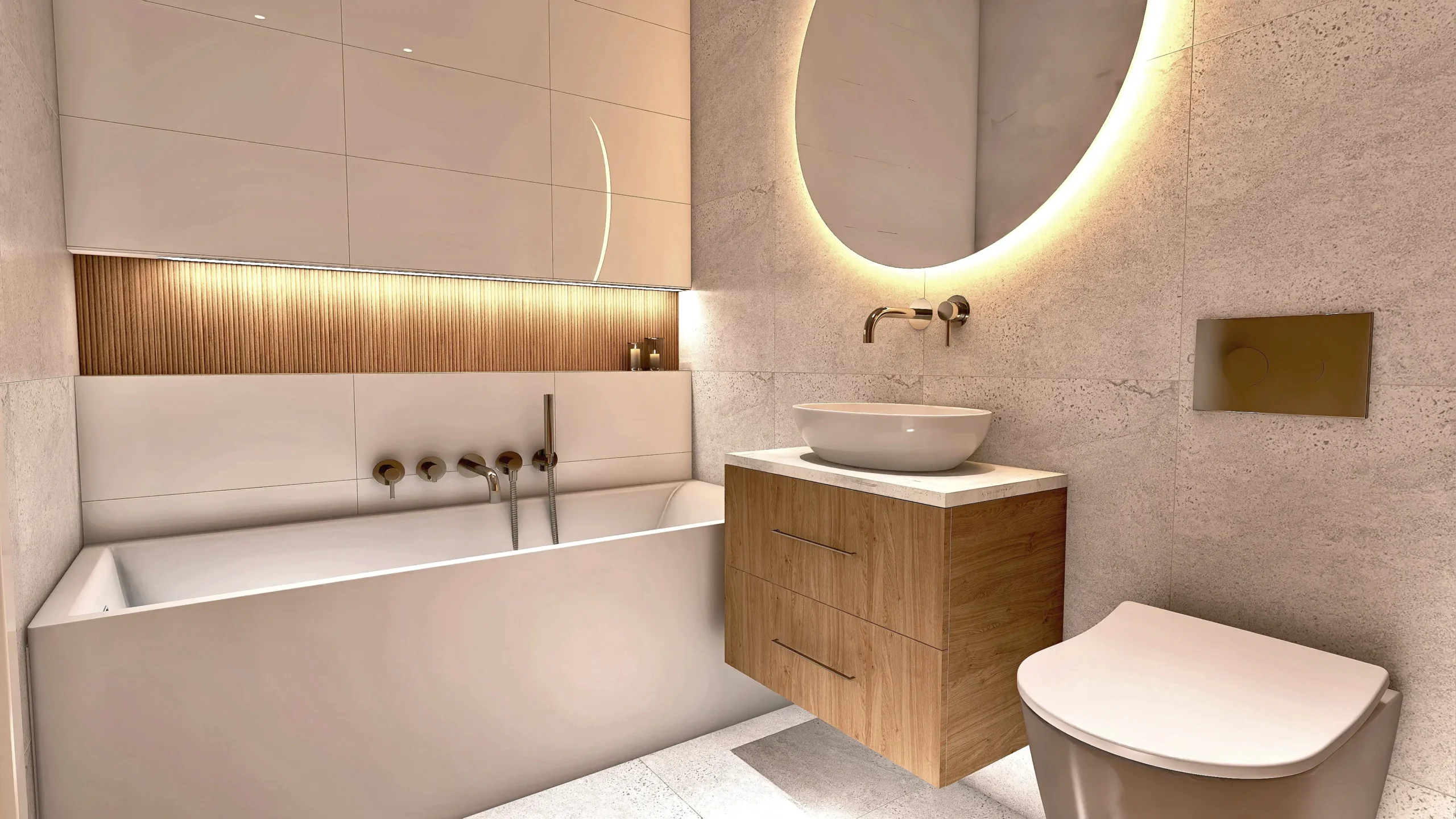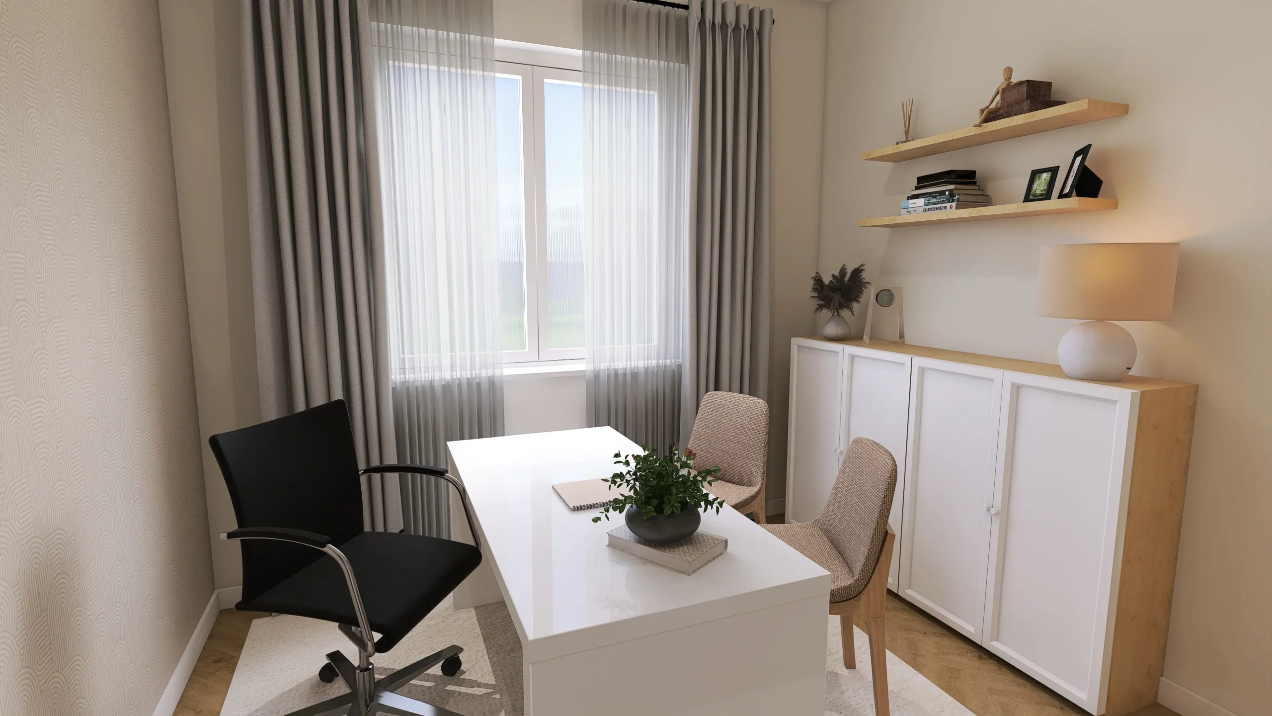 Całość wnętrza utrzymana jest w naturalnej palecie barw, gdzie dominuje ciepło drewna i świeżość bieli. Minimalistyczny styl podkreślają starannie dobrane detale oraz naturalne materiały, które nadają przestrzeni harmonijny i spokojny charakter. Projekt odzwierciedla dążenie do prostoty, jednocześnie zapewniając pełen komfort codziennego użytkowania.